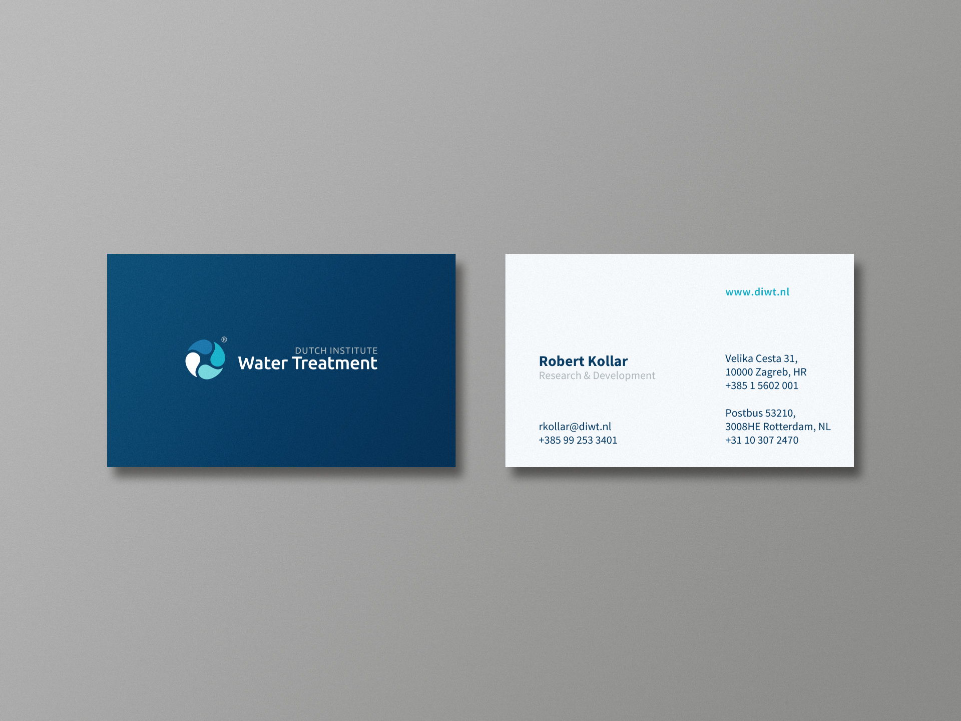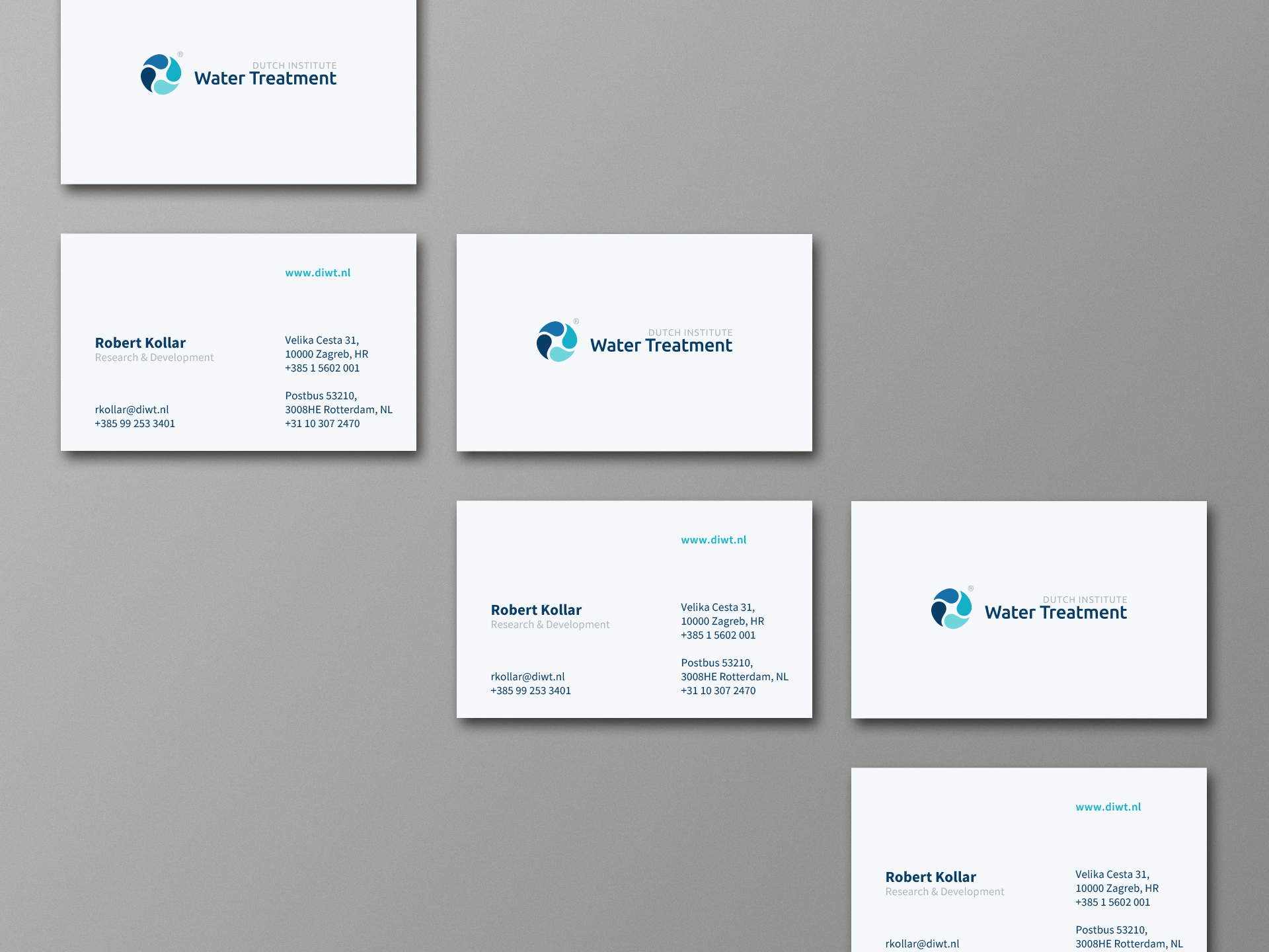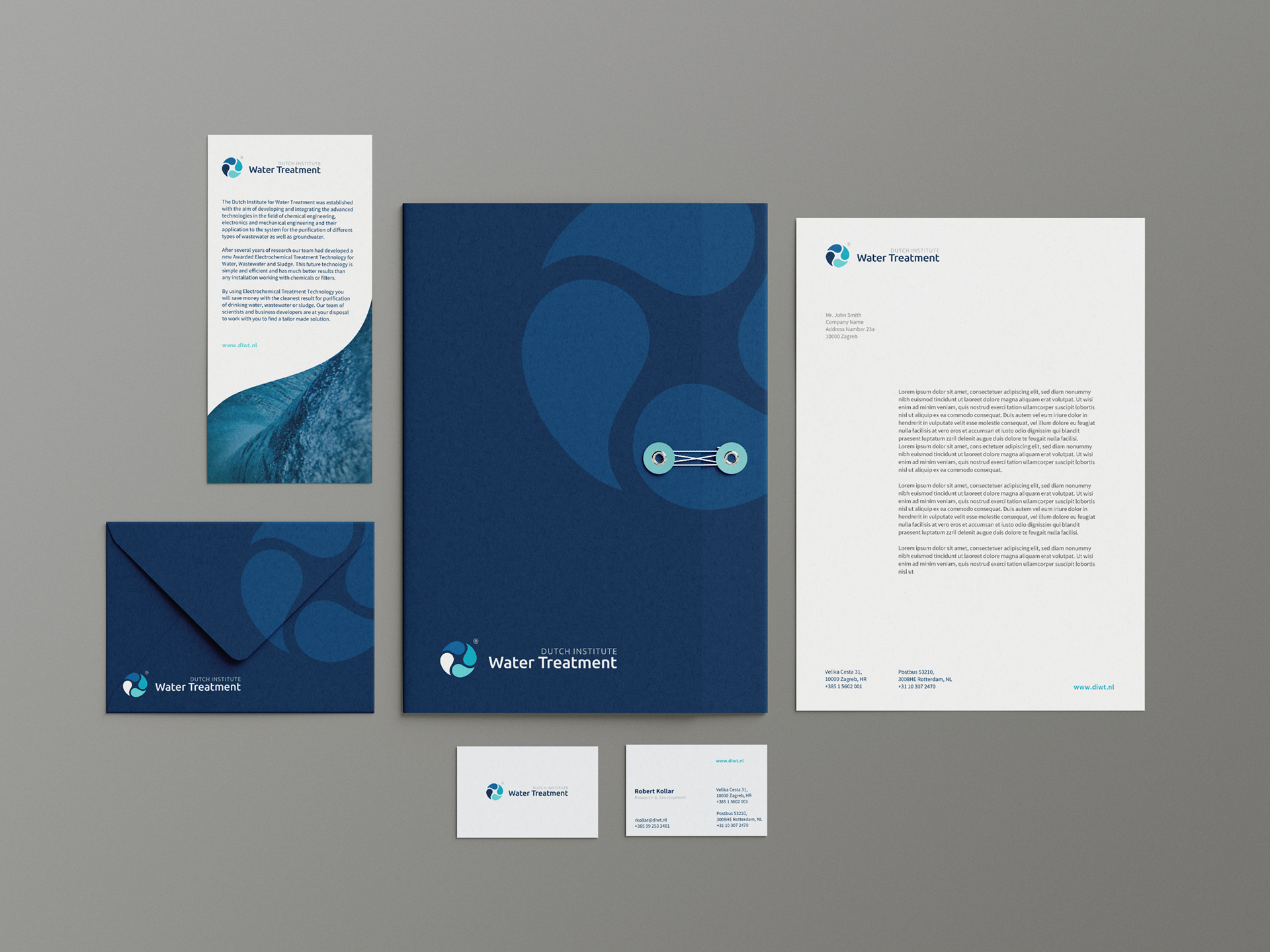 Brand identity for Dutch Institute for Water Treatment. DIWT was established with the aim of developing and integrating the advanced technologies in the field of chemical and mechanical engineering and their application to the system for the purification of different types of wastewater.